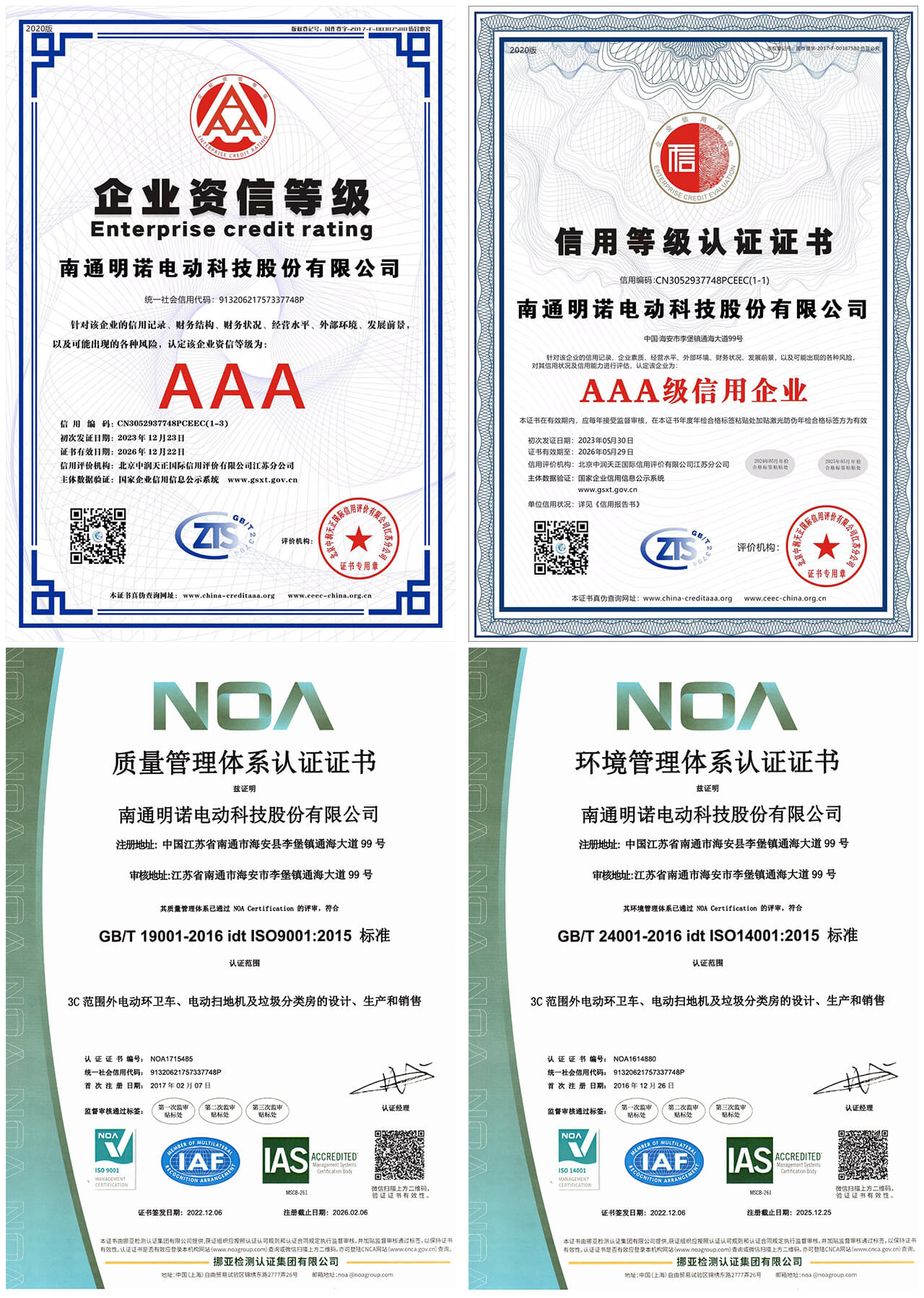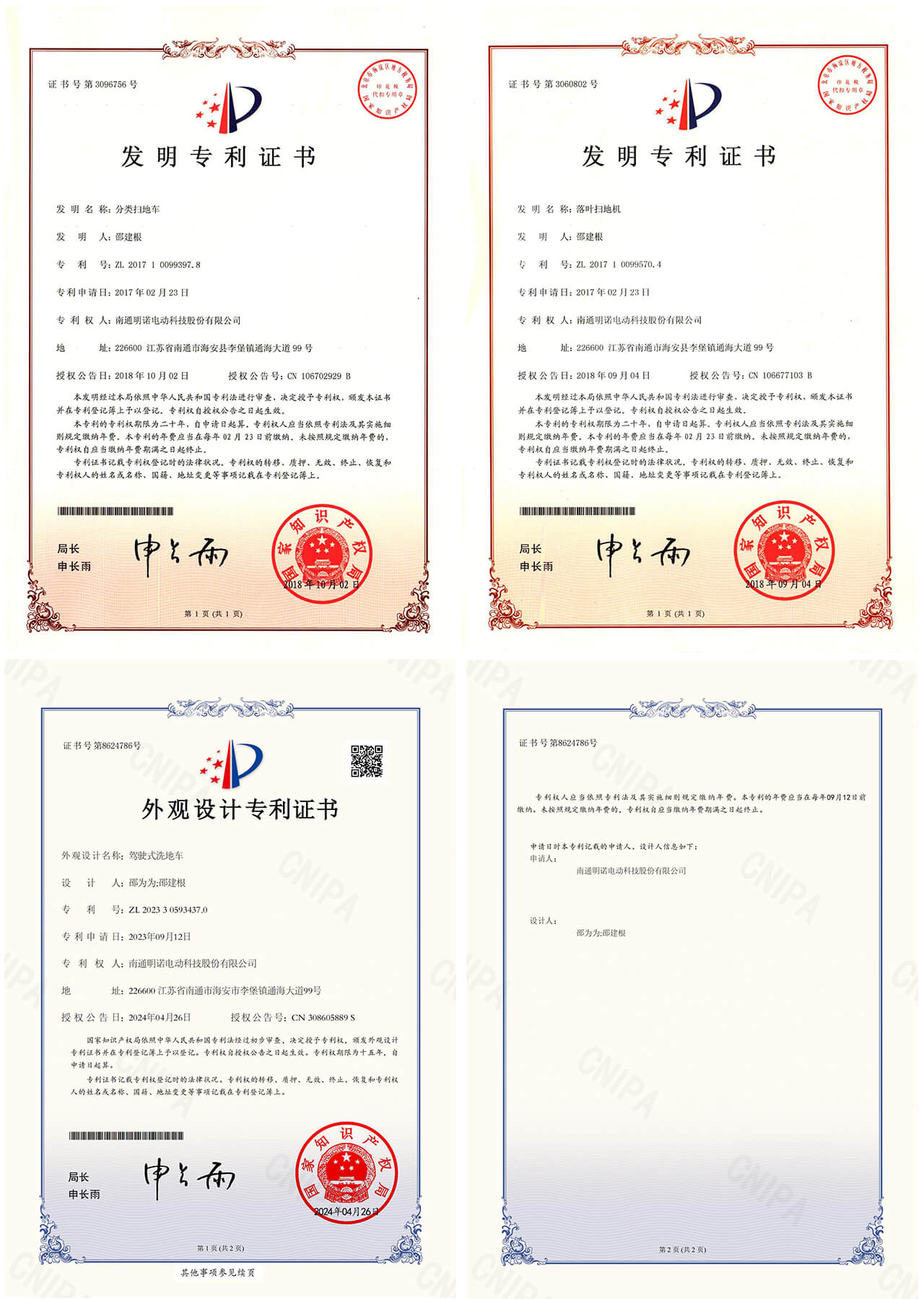 明诺以精益求精的工作态度和不断创新的精神,使明诺品牌在环卫和保洁行业中树立了良好的形象。明诺坚持走“产、学、研”合作之路,与清华大学、东南大学、中科院及东风股份等高校和研究机构建立战略合作关系,明诺现已获得发明专利、实用新型专利、外观设计专利及软件著作权等百余项。