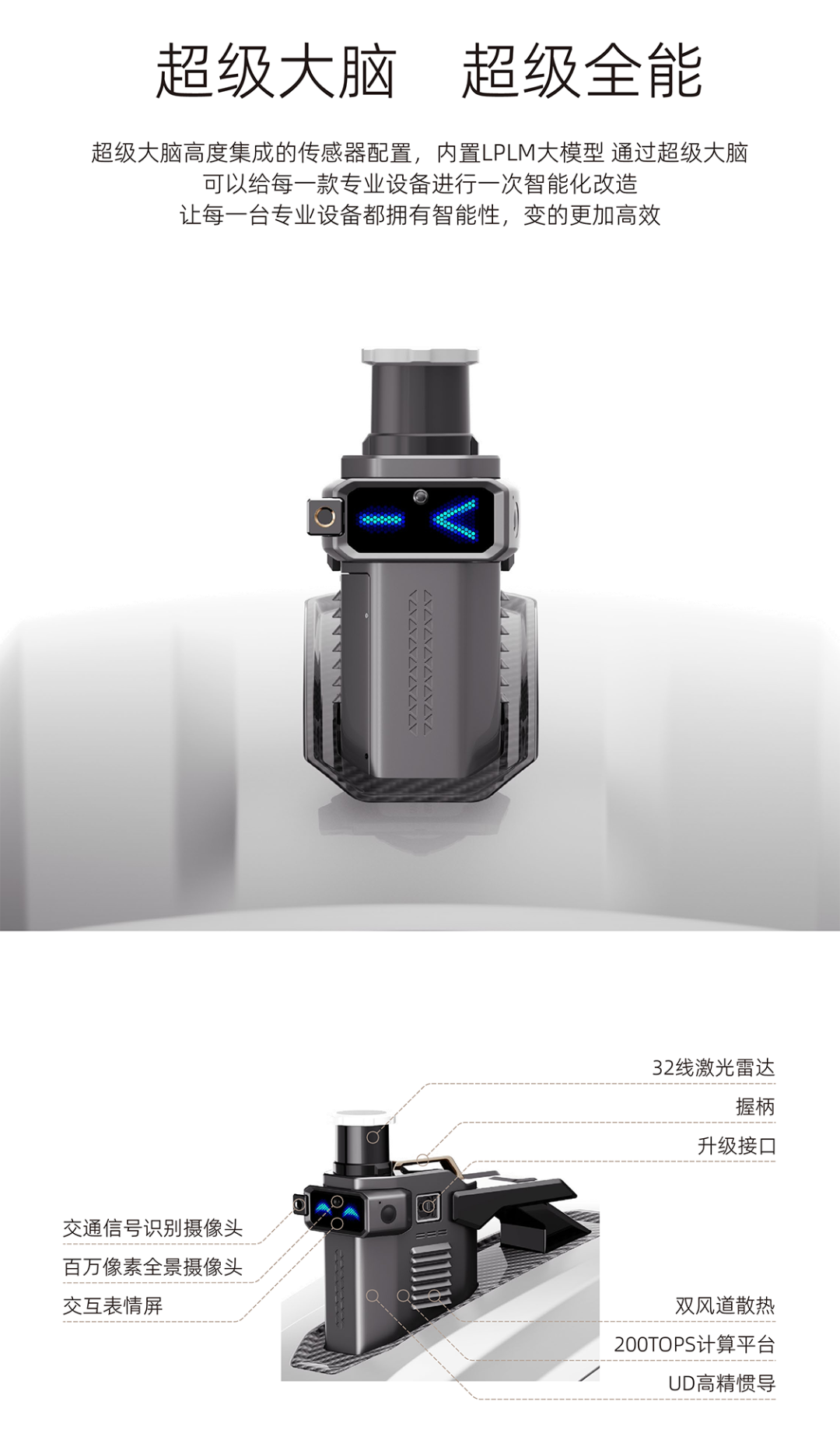 超级大脑高度集成的传感器配置,内置LPLM大模型 通过超级大脑可以给每一款专业设备进行一次智能化改造让每一台专业设备都拥有智能性,变的更加高效