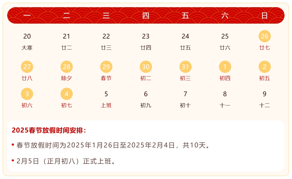 春节放假时间为2025年1月26日至2025年2月4日,共10天。2月5日(正月初八)正式上班。