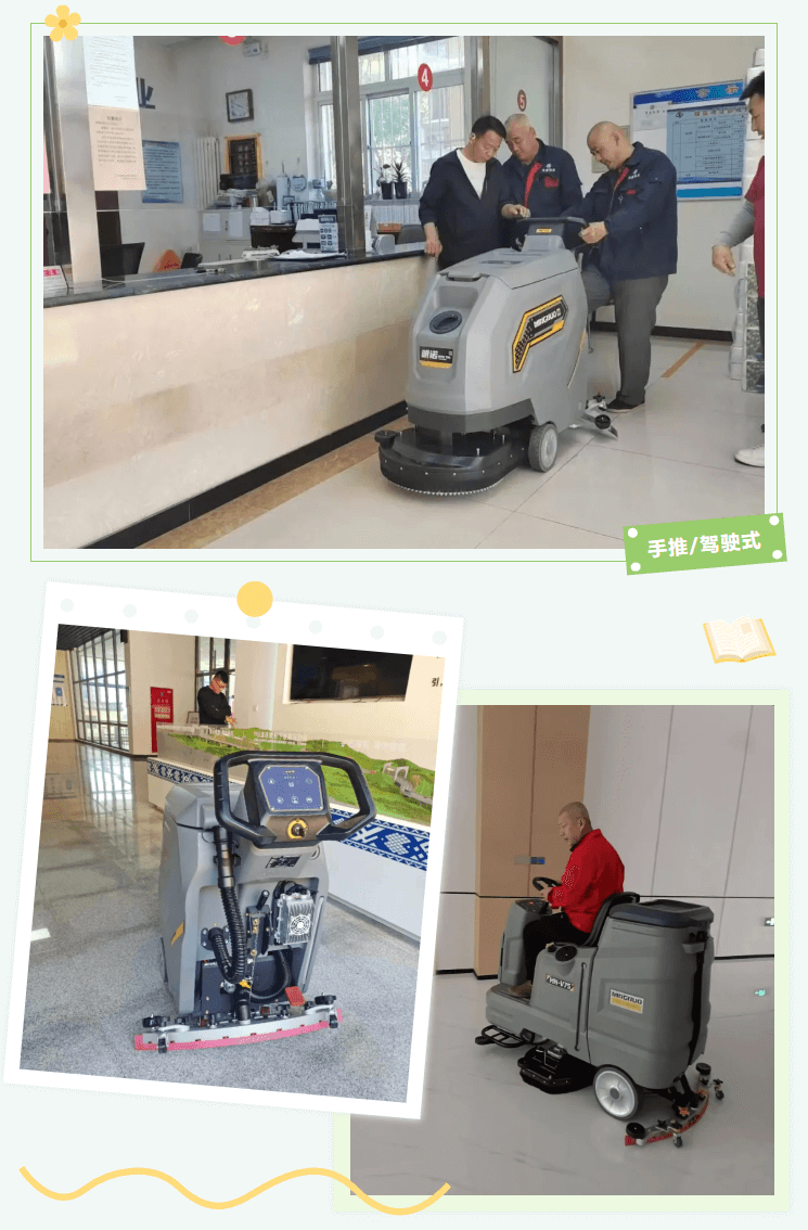 洗地机“净”彩表现:明诺洗地机横扫食堂油污、教学楼走廊水渍、宿舍楼道灰尘,洗擦吸一体完成,让校园每个角落"净"享清新!