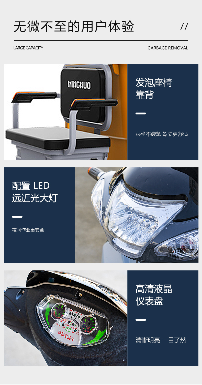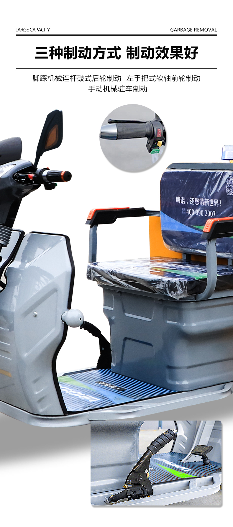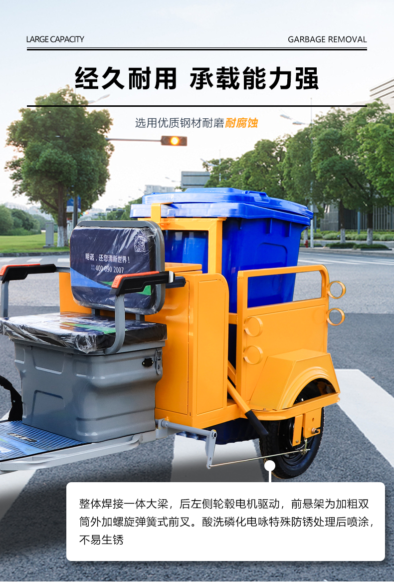MN-H35DT可装载一只240L标准垃圾桶,整车小巧灵活,随走随停,且易清洗,装卸方便,适用城镇街道、工厂、学校、医院、居民生活区、机关单位等路段垃圾收集和巡回保洁使用。