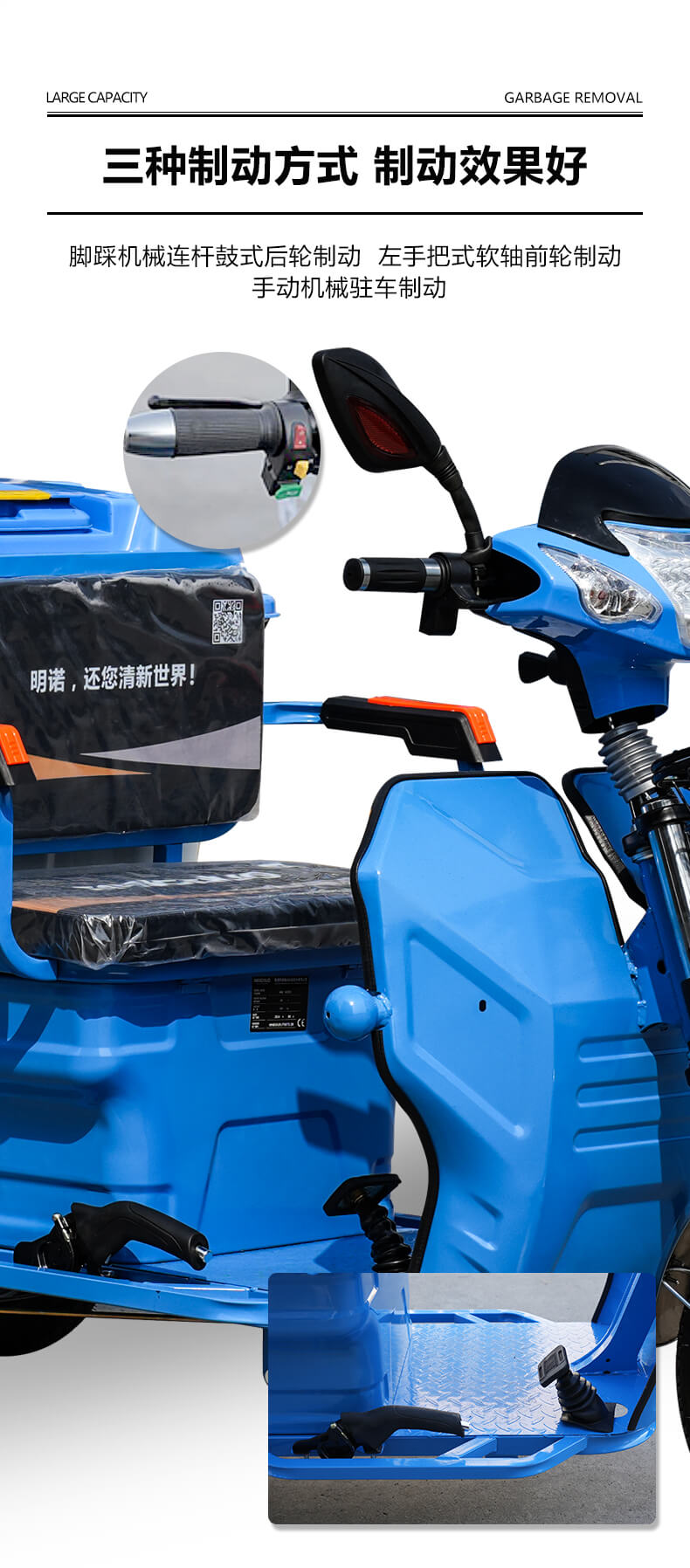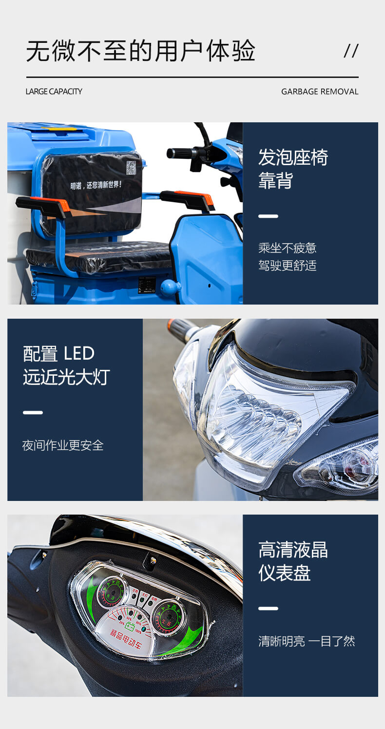 MN-H30X三轮保洁车 整车方便灵活,随走随停,仅需一人就可操作,且易清洗,装卸方便,便于垃圾收管、储存、清运。适用城镇街道、工厂、学校、医院、居民生活区、机关单位等路段垃圾收集和巡回保洁使用。