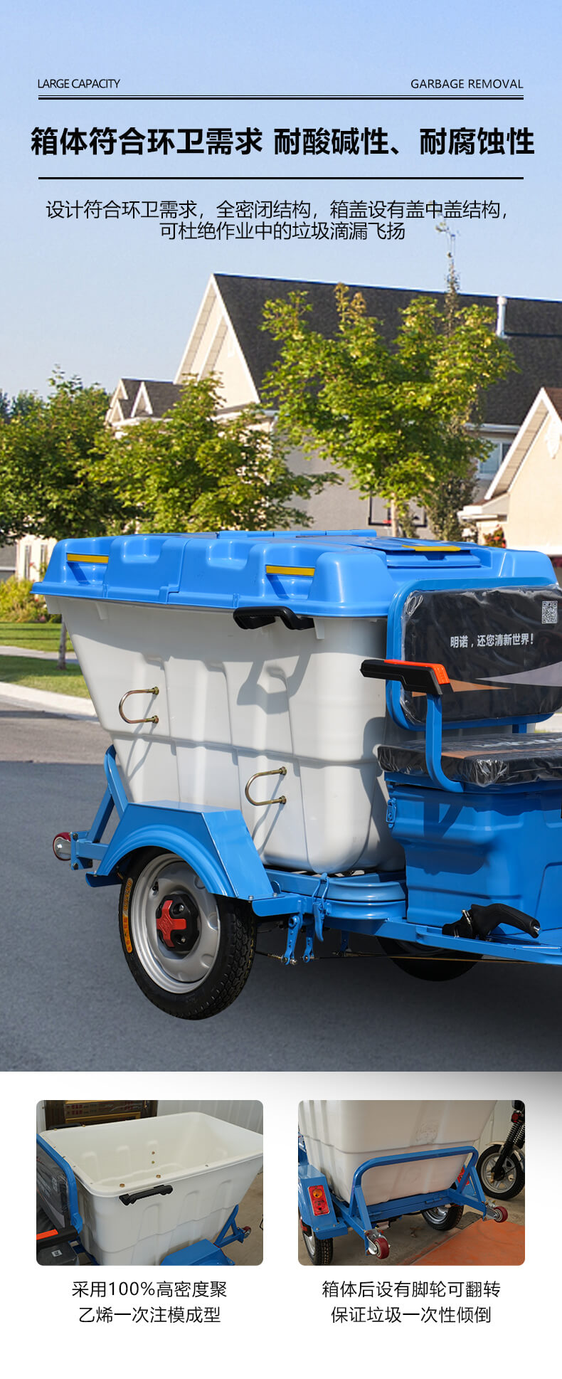 l箱体设计符合环卫需求,全密闭结构,箱盖设有盖中盖结构,可杜绝作业中的垃圾滴漏飞扬。