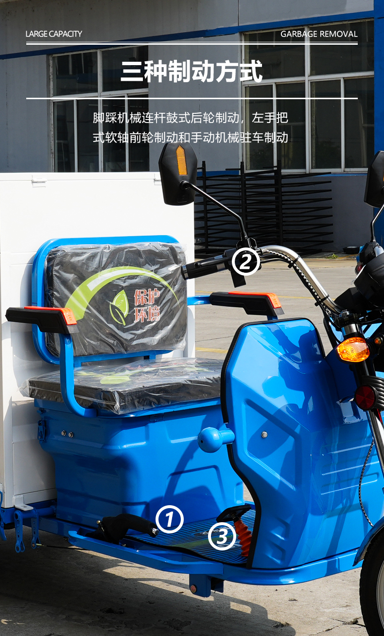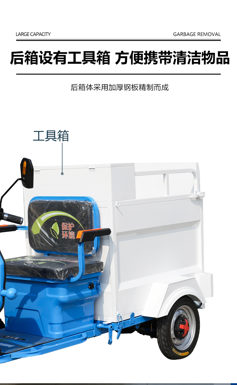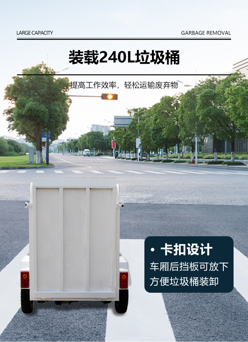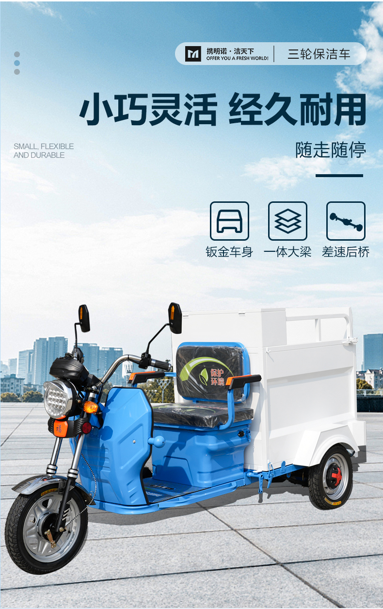 MN-H35D三轮单桶保洁车可装载一只240L标准垃圾桶,整车小巧灵活,随走随停,且易清洗,装卸方便,适用城镇街道、工厂、学校、医院、居民生活区、机关单位等路段垃圾收集和巡回保洁使用。