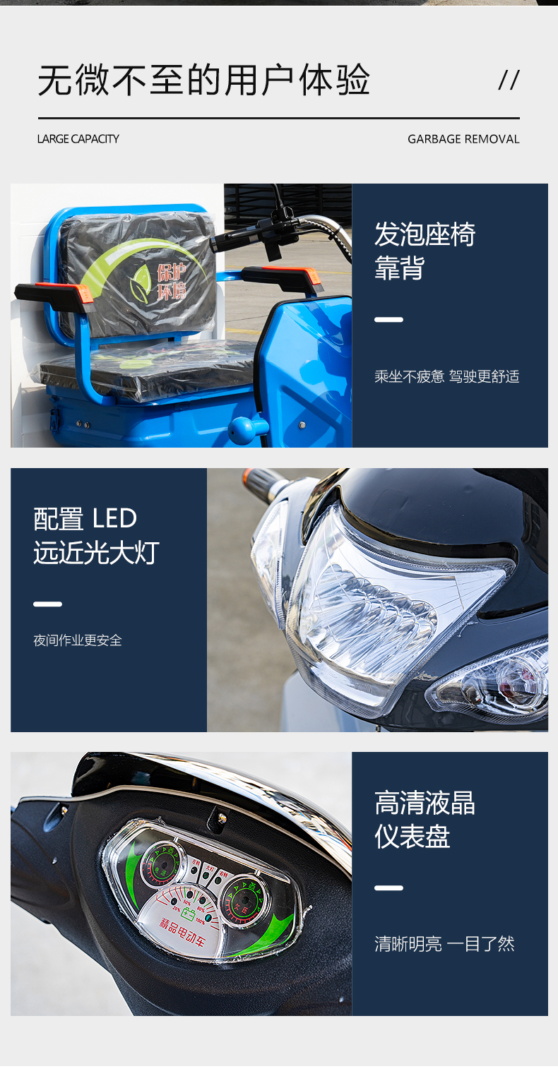 l整车装有LED照明灯、左右转向灯、刹车灯、仪表、电喇叭、后视镜、防盗报警等,有效保证行车安全。