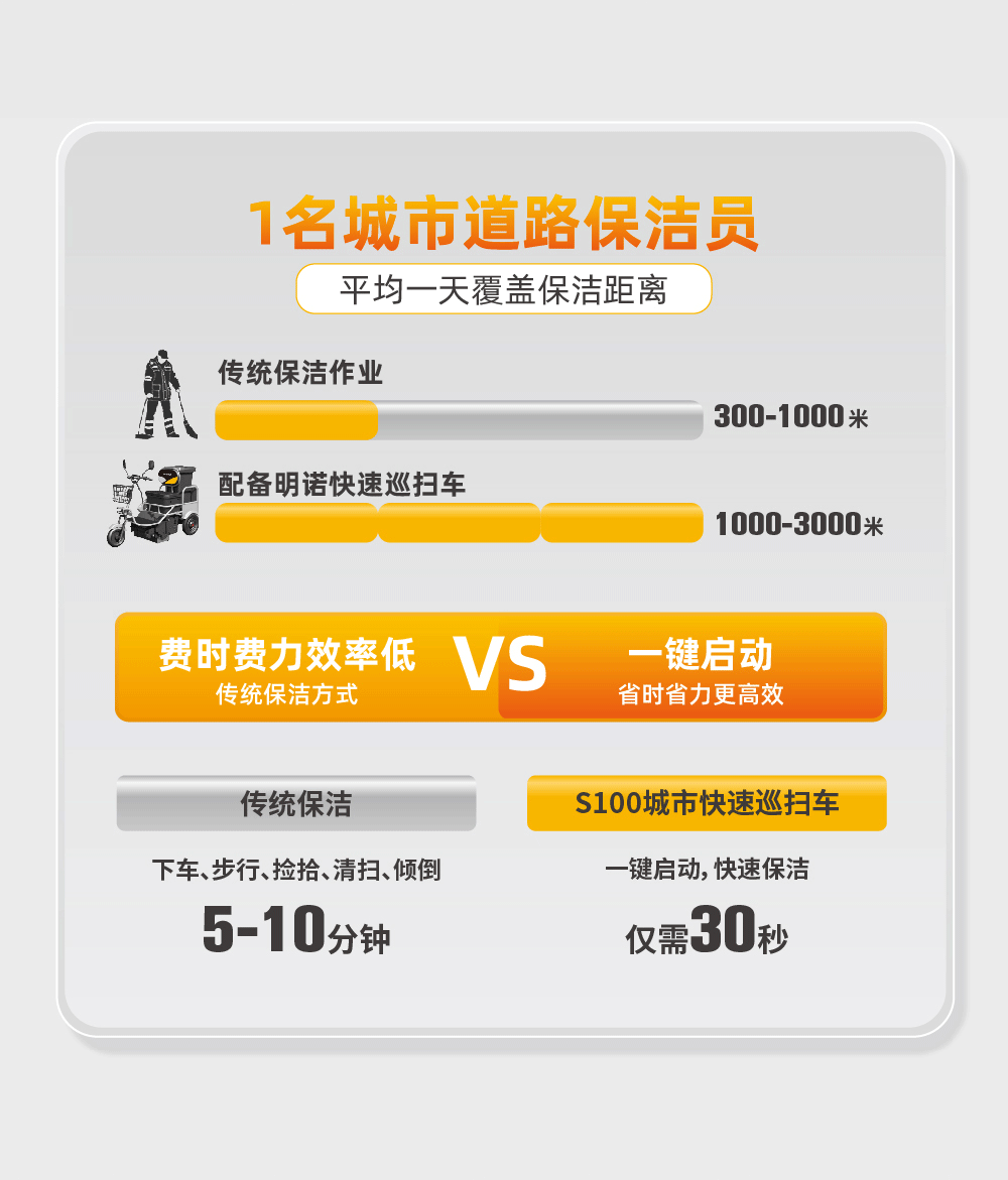l替代保洁人员反复下车捡拾、使用扫帚清扫、步行等环卫作业,一键即可完成,提高工作效率。