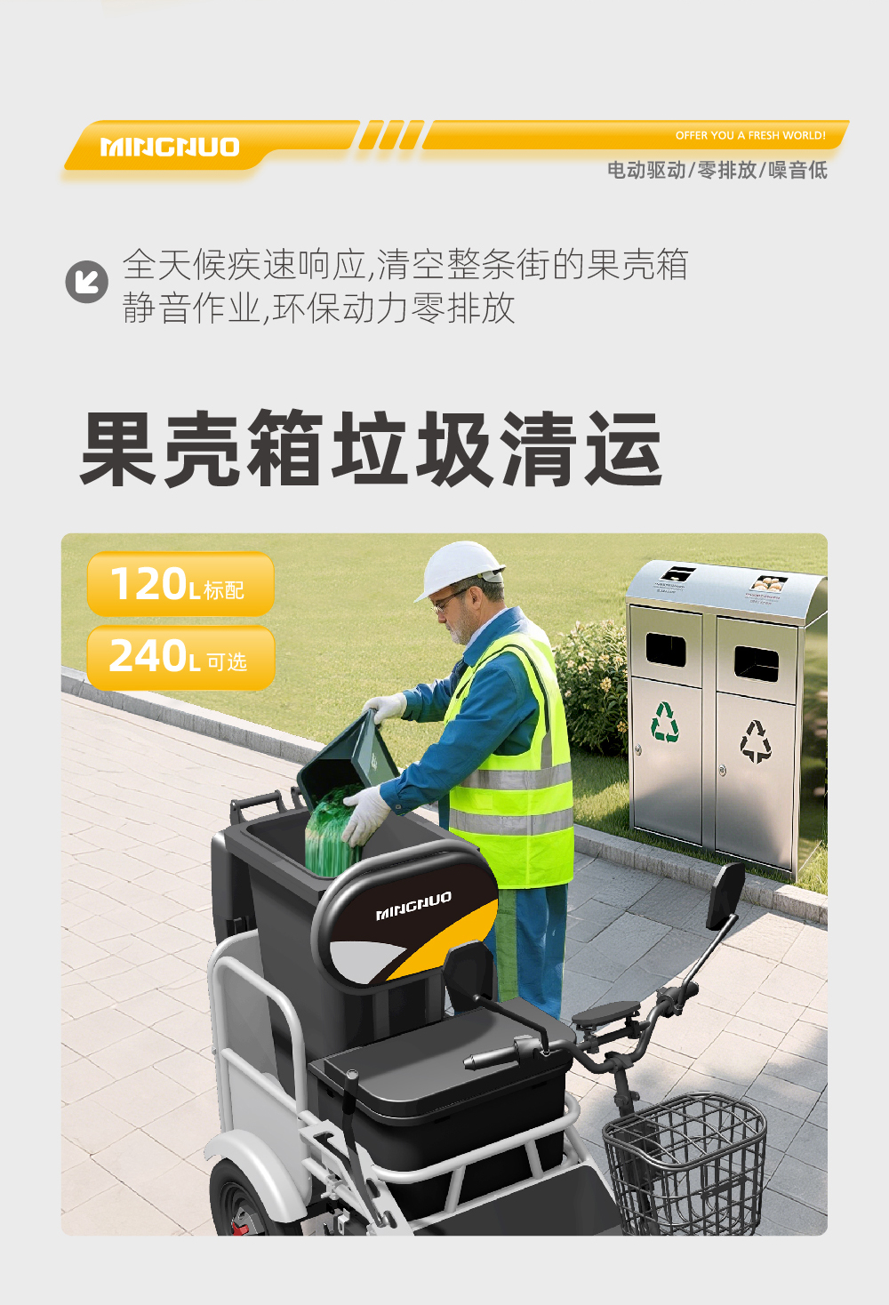 l大容量垃圾收运,扫装一体。配置120L垃圾桶(可选240L),清扫与收运一车完成,提升效率。