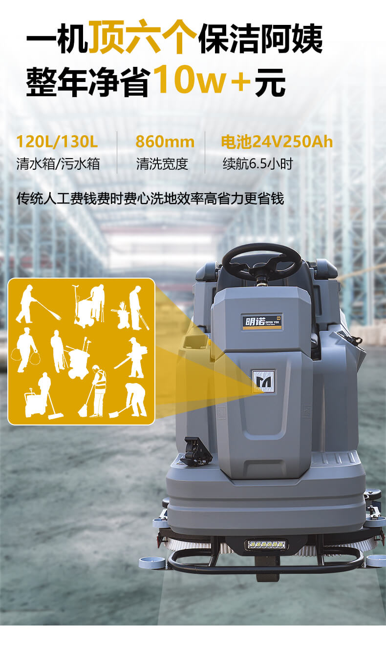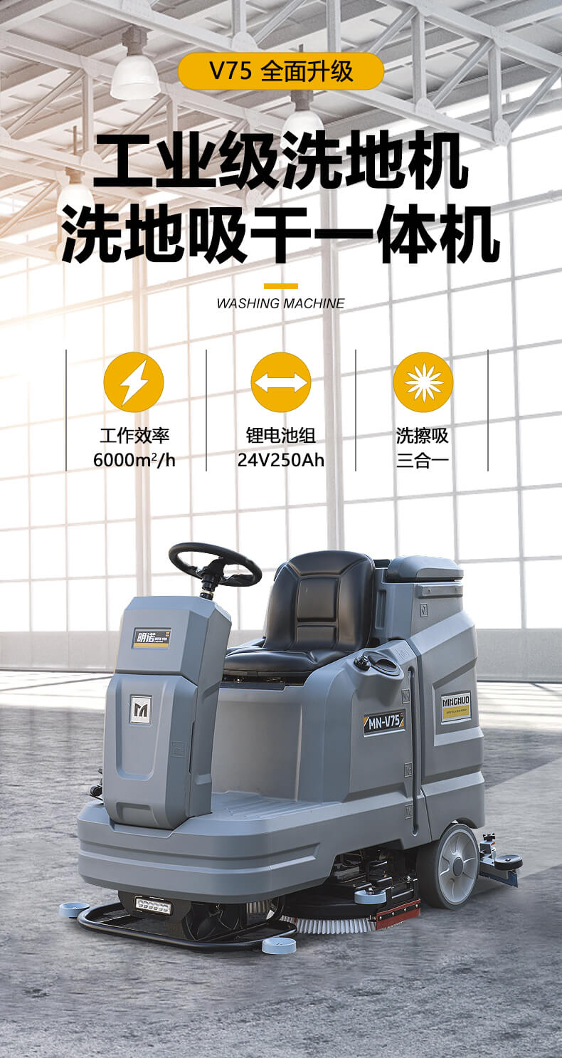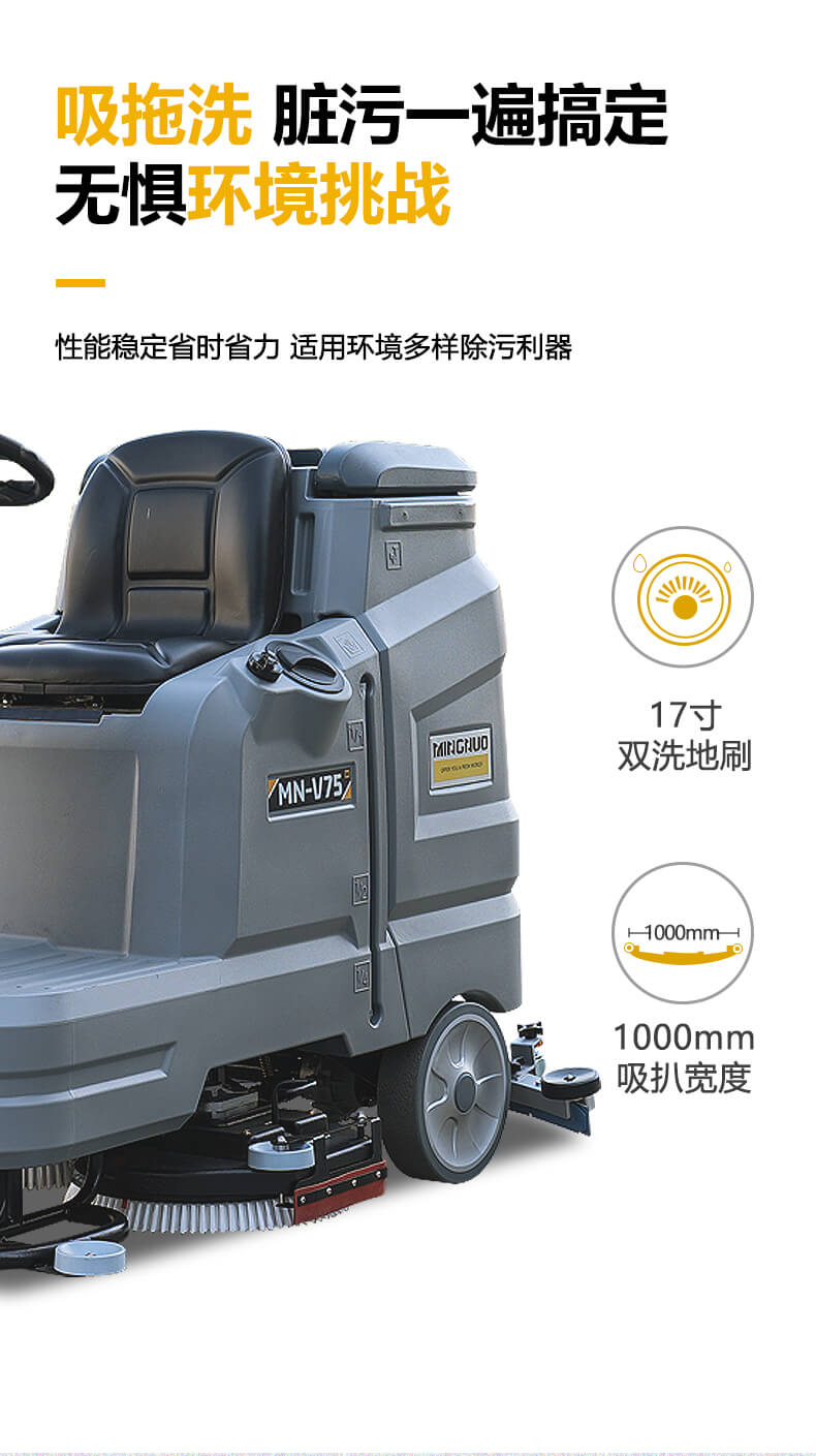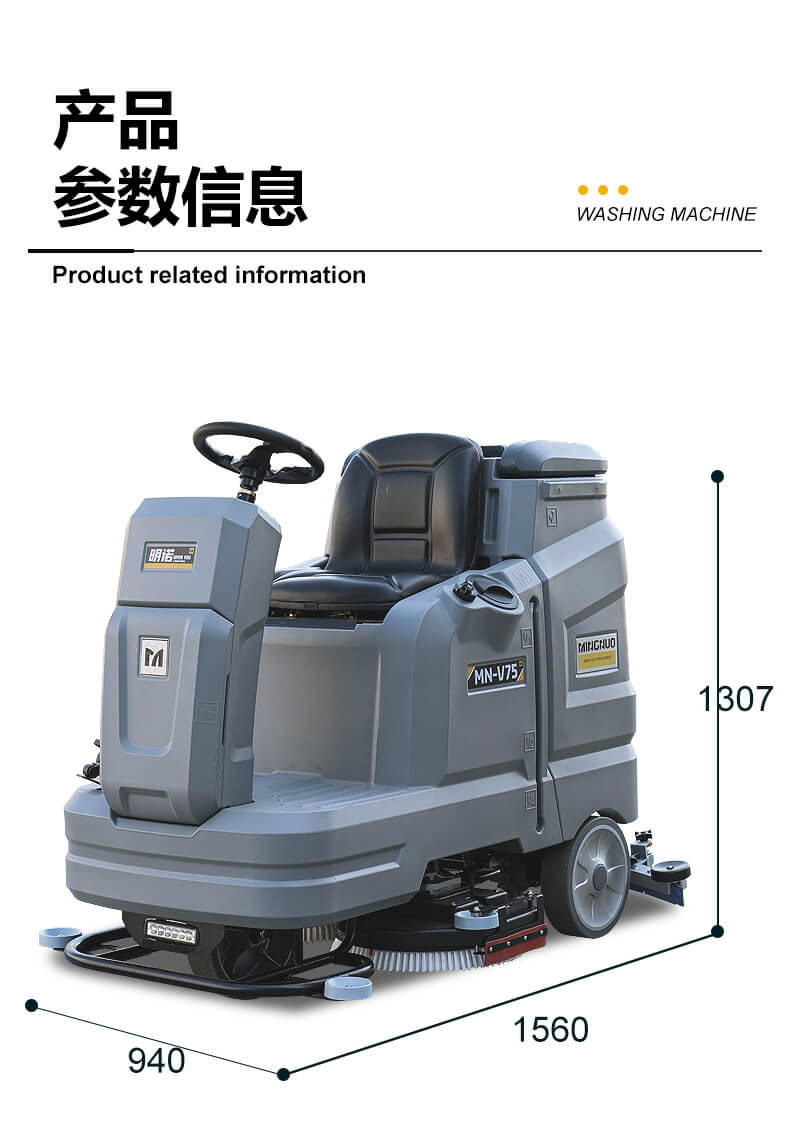 MN-V75中大型驾驶式洗地机,配备120L清水箱和130L污水箱,可用于大理石、环氧地坪、瓷砖、地板砖、金刚砂地坪等地面的大面积清洗,可添加清洁剂清理油污地面。持久续航以及强大的触底压力使其能胜任大型商业场所的高效清洁,广泛应用在大型零售店、生产工厂、仓储大厅、物流仓库、购物中心、会议中心、机场、停车场、火车站等领域。
