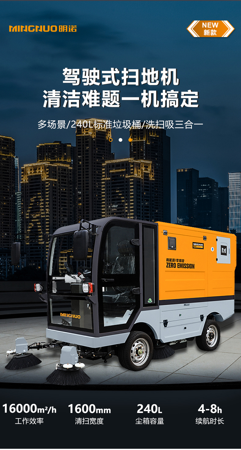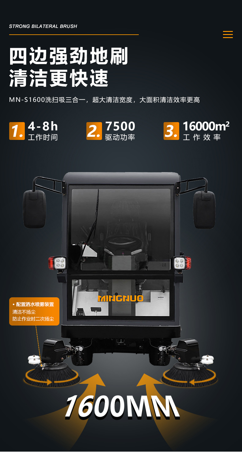 MN-S1600采用240L标准垃圾桶收集垃圾,液压升降,垃圾桶更换方便快捷。输送桶体采用多滚刷结构,结构新颖,具有能耗低,噪音小,易检修等优点。适用于环卫系统,背街小巷清扫。