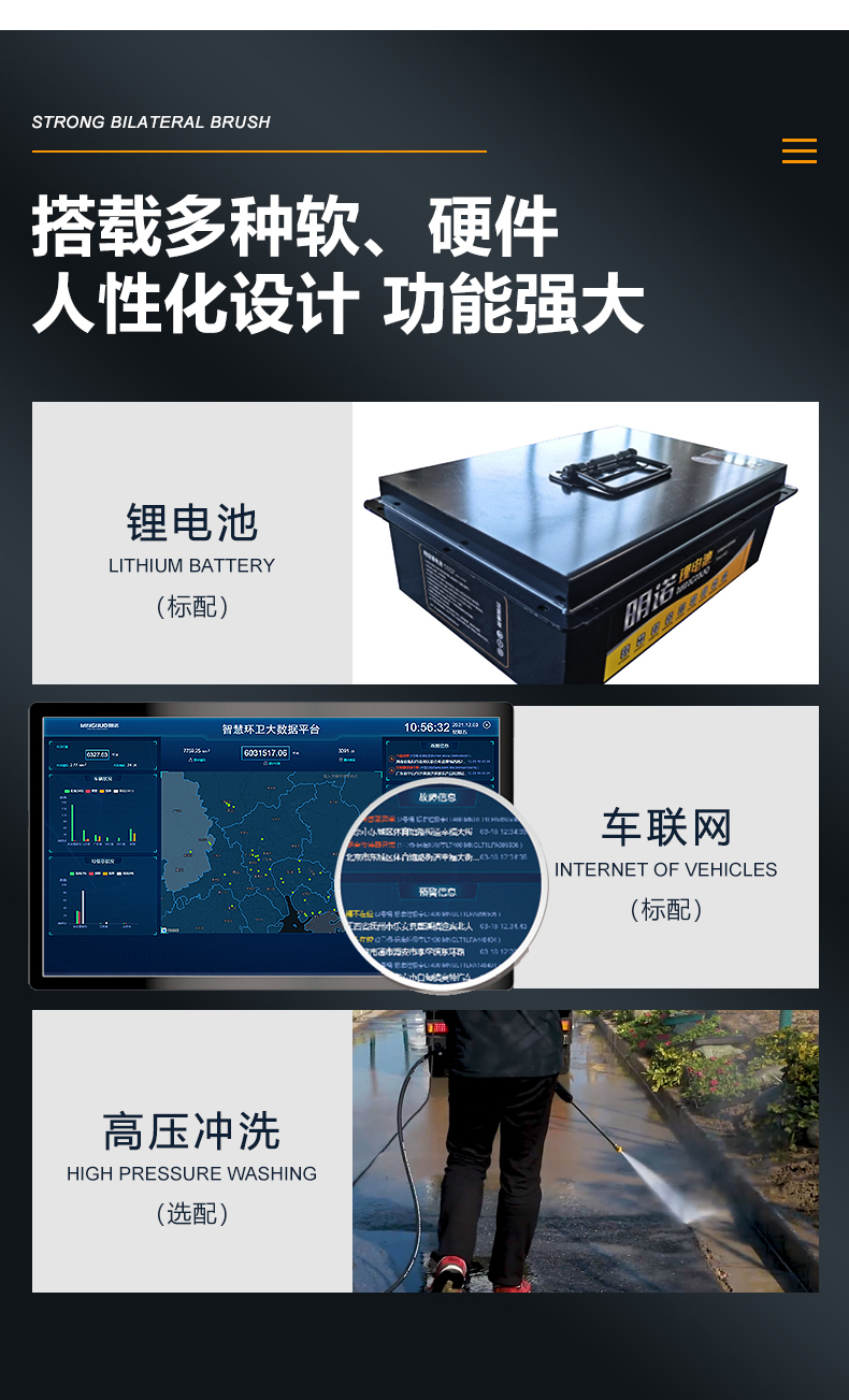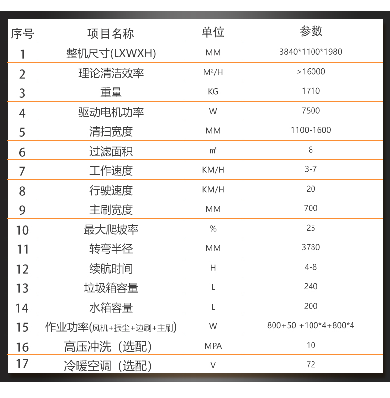 16 | 尺寸 | mm | 3465×1265×2010(不含边刷不含空调) 3875×1760×2165(含边刷含空调) |