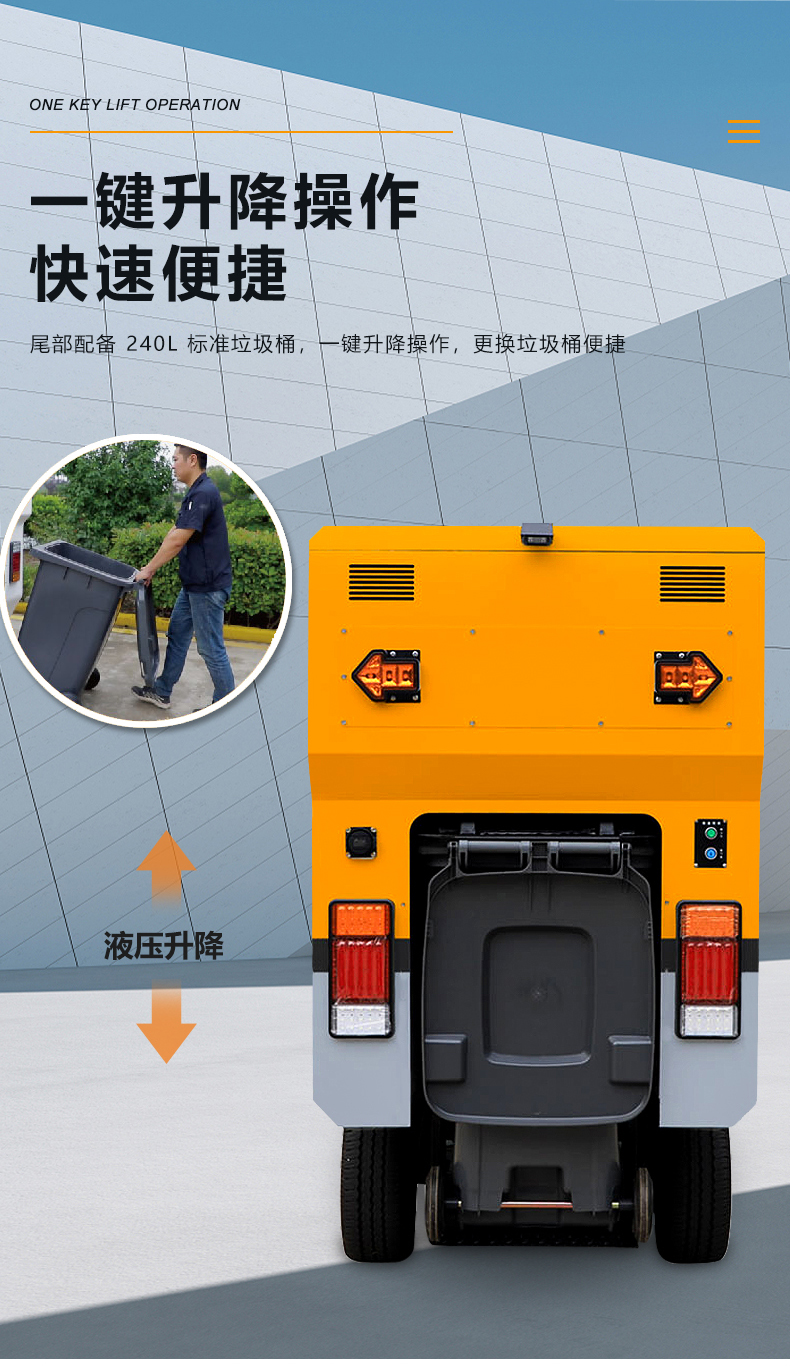 l尾部配备 240L 标准垃圾桶,一键升降操作,更换垃圾桶便捷。