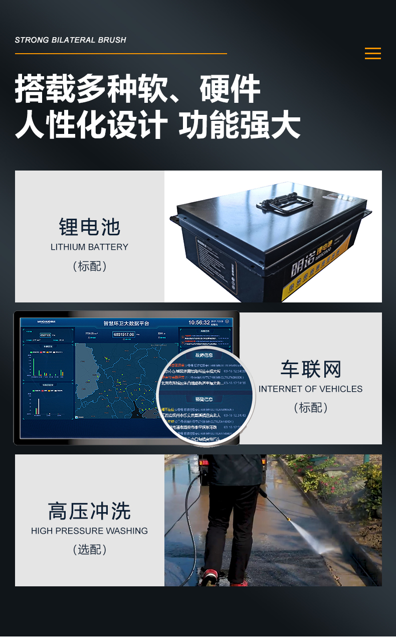 MN-S1800四轮扫地车配置液压升降前后边刷,动作灵敏安全可靠。前后加大功率边刷电机和刷盘,清理更彻底,使用寿命更长。清扫宽度达到1800mm以上,作业效率更高。边刷机构自带防撞保护功能。标配72V300Ah锂电池,工作时间长,选A品电芯,充放电循环3000次。标配冷暖两用空调和高压冲洗功能,可选配雾炮和4KW高压泵。尾部醒目箭头灯,作业提示更安全。