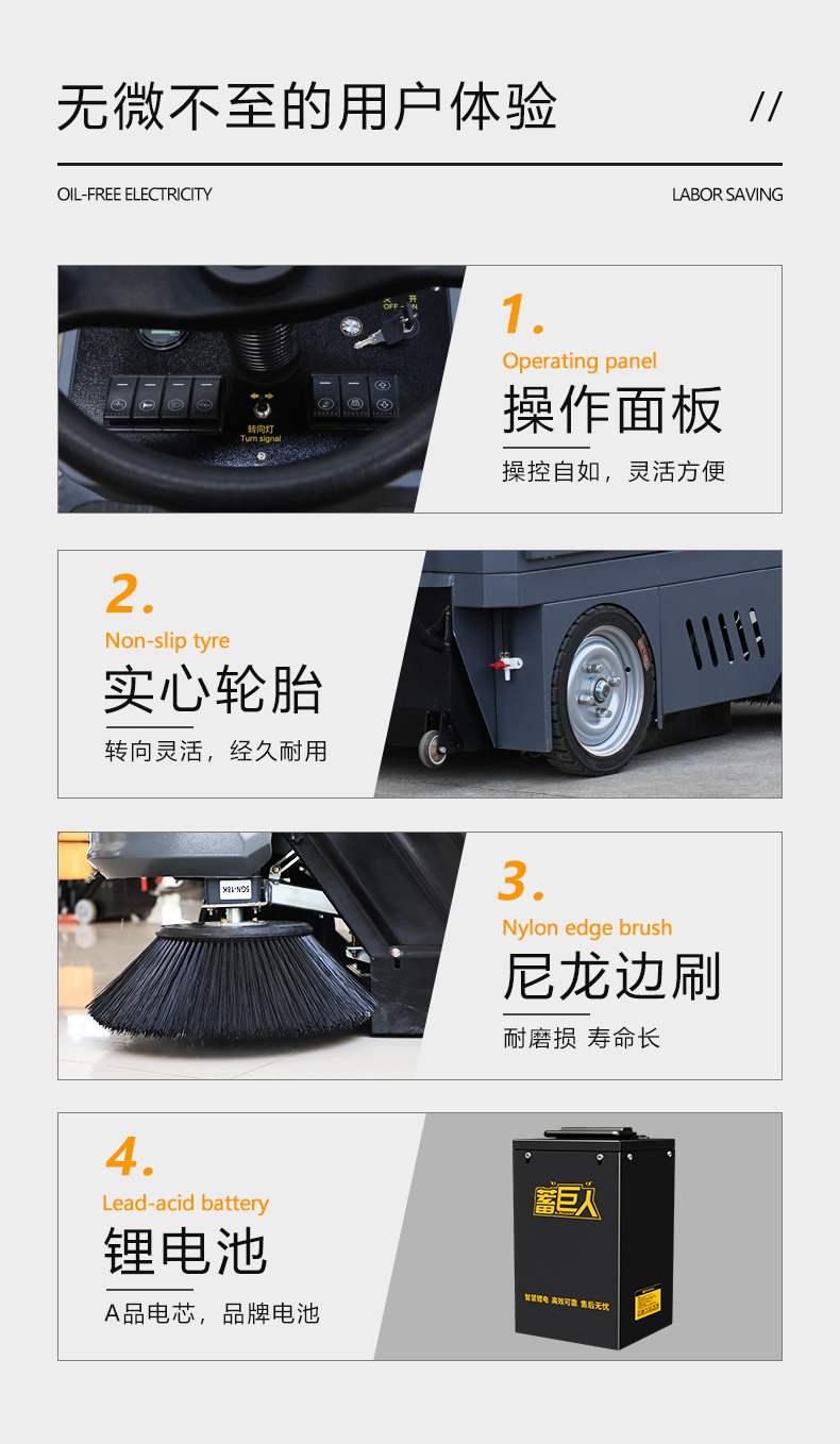 MN-C150驾驶式扫地车,清洁宽度1,200mm,每小时可高效清洁7000㎡以上的地面,可有效清洁沥青,水泥,砂石,毛石等洗地机无法清洗的地面。特别适合清扫落叶、烟蒂、小石子、尘土等固体颗粒物、常规生活固体小垃圾及日常灰尘。