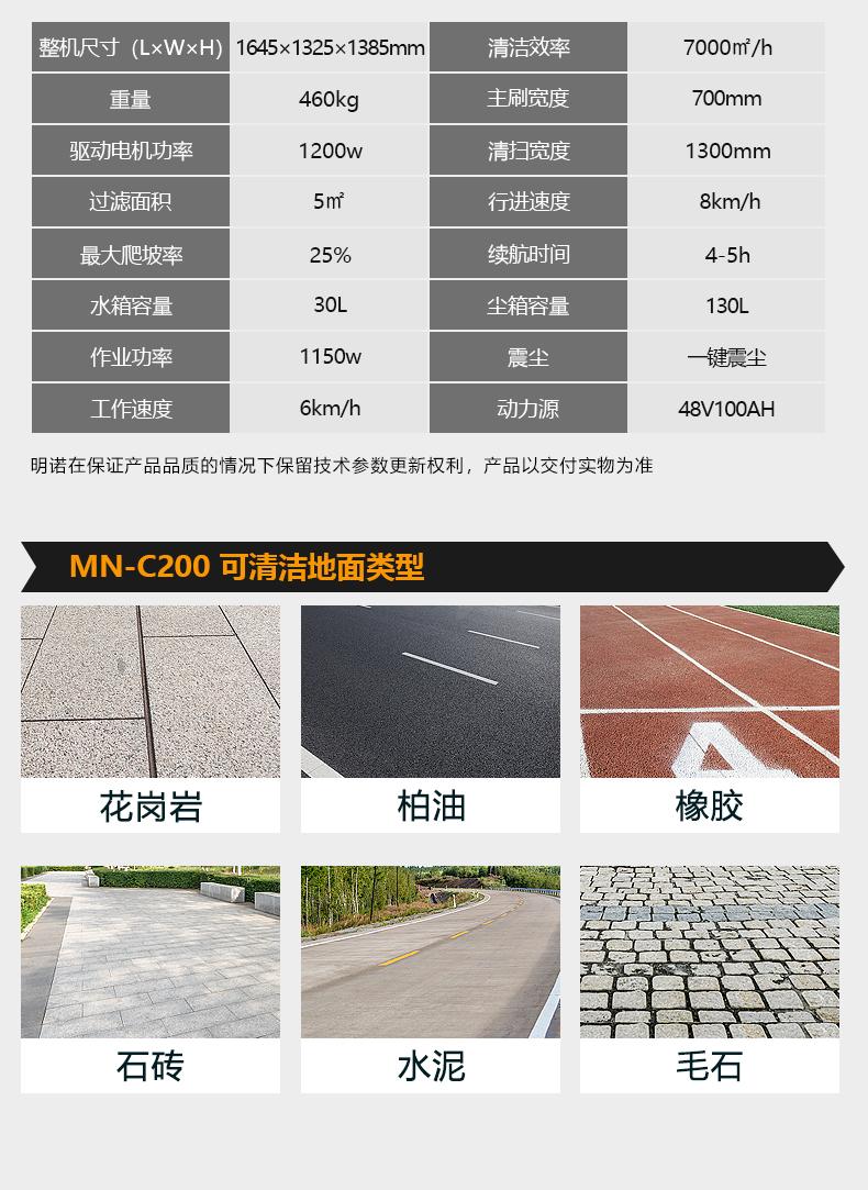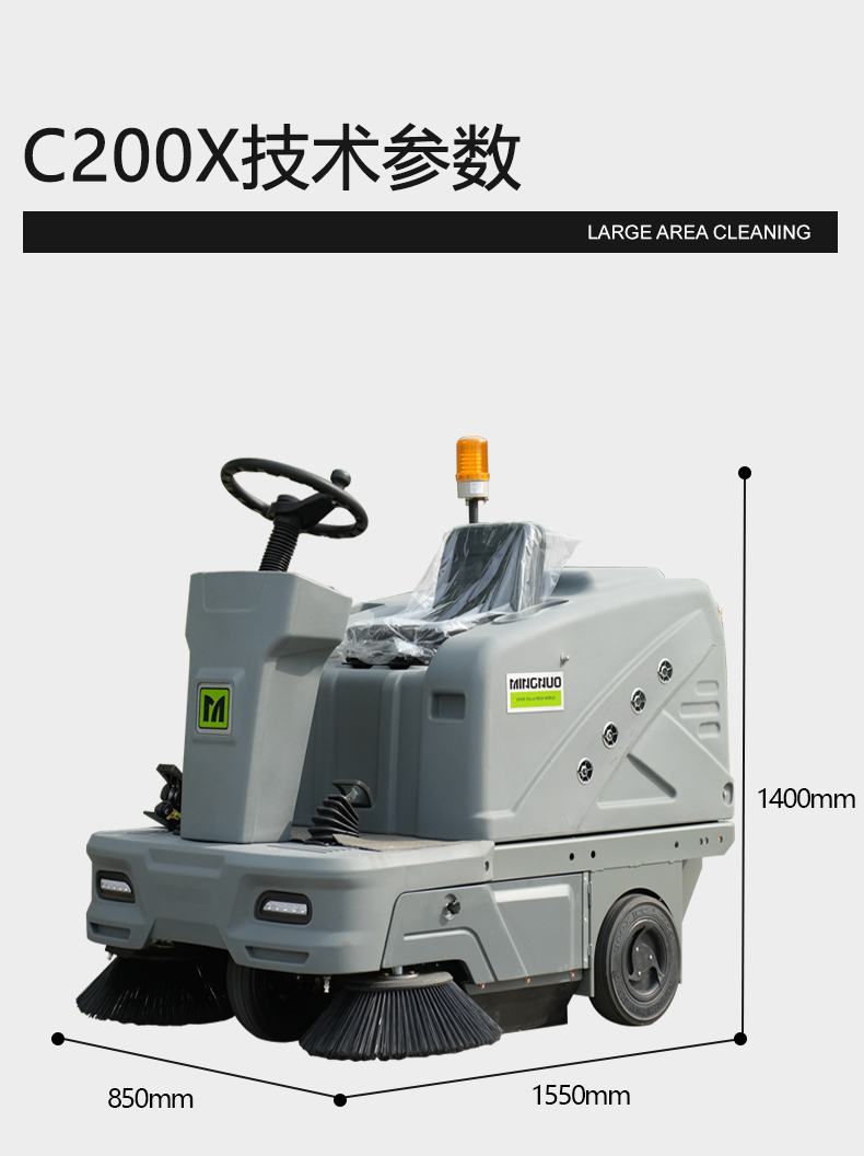 MN-C200X 明诺高品质商业级驾驶式扫地车,清洁宽度1,300mm,每小时可高效清洁7,000m2以上的地面,告别传统,有效替代30人以上 的人工,可有效清洁沥青,水泥,砂石,毛石等洗地机无法清洗的地面。